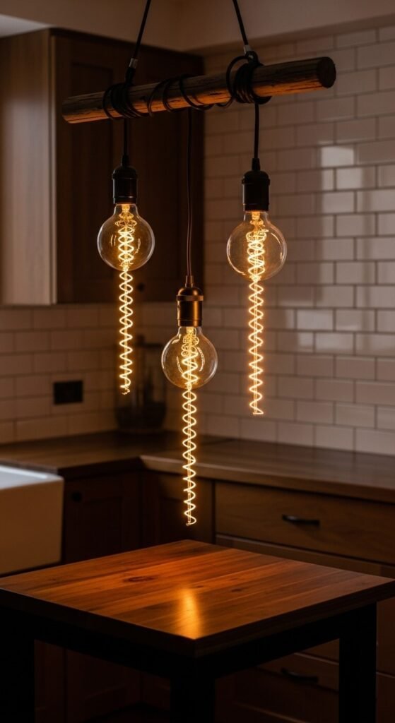 This is a DIY pendant light cluster that costs about $30 to make. Buy a wooden dowel, three pendant cord sets, and three Edison bulbs from a hardware store. Mount the dowel above a dining table or kitchen island with simple L-brackets. Hang each bulb at a slightly different height. The exposed filament in Edison bulbs is warm, decorative, and flattering. Screw in warm-toned bulbs (not clear daylight ones) for maximum ambiance. This project takes one afternoon and no special skills.