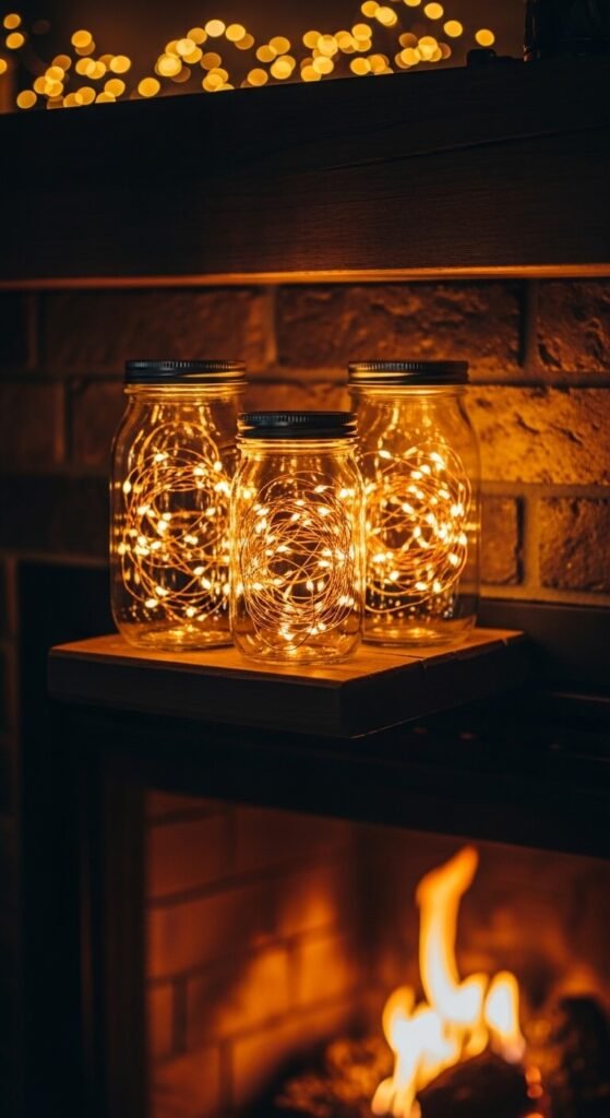 Drop a battery-powered micro fairy light strand into a glass jar or vase and you have an instant lantern. A pack of 10 small fairy light strands (with batteries) runs about $12–$18 online. Use mason jars, apothecary bottles, or old wine carafes. Group several together on a mantel or shelf. The glass bounces and amplifies the tiny bulbs. These work great on outdoor tables too — no cords, no outlets required. Change the jar, change the whole look.