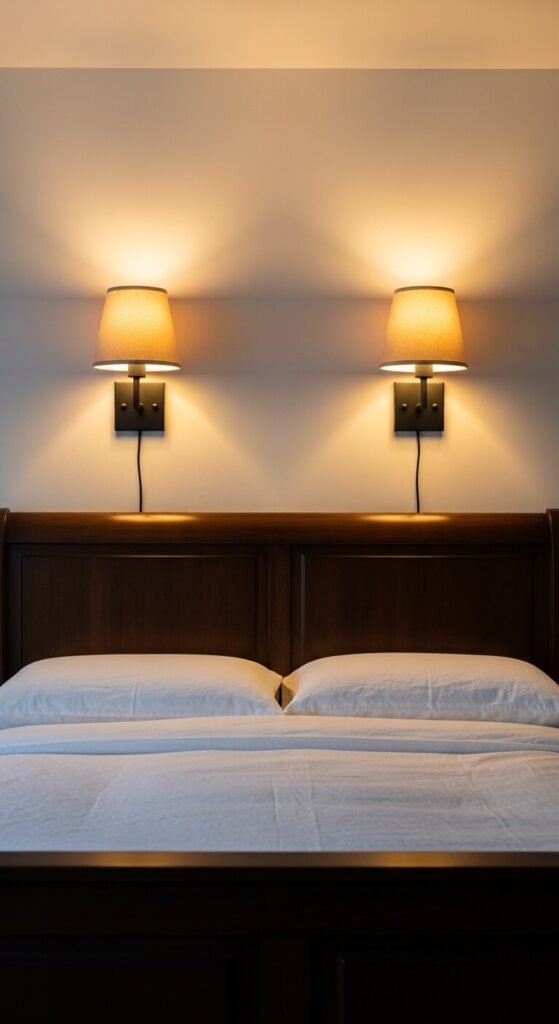 Plug-in wall sconces (no hardwiring, no electrician) mount with two screws and run a cord down the wall or behind the bed frame. They cost $25–$60 each. Pair two on either side of a headboard and you instantly create a hotel-style bedroom with reading light exactly where you need it. This frees up nightstand space and makes the room feel intentionally designed. Look for sconces with fabric shades in warm white or cream for the most flattering glow.