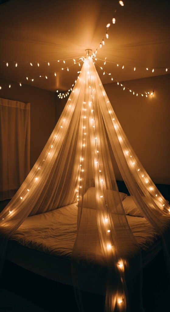 Attach a hook to the center of your bedroom ceiling and drape four or five string light strands outward to the corners of the room. The result looks like a glowing tent canopy. Total cost: under $40 for hooks, strands, and a power strip. Use a single outlet with a timer so the lights come on automatically at dusk. The overhead canopy effect turns a plain bedroom into something that feels genuinely enchanting. Guests always ask about it.