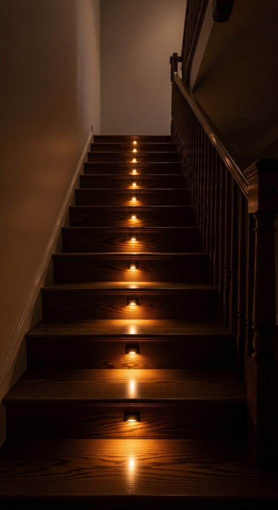 Adhesive LED step lights or motion-activated staircase lights ($20–$40 for a set) mount under each stair tread and turn on when someone walks by. They serve a practical purpose — you won’t trip at 2am — but they also look genuinely beautiful in a dark hallway. The low-level glow along a staircase creates drama without any ceiling fixture. Battery-powered versions require zero installation. These are one of those upgrades that’s so useful people wonder why they didn’t do it sooner.