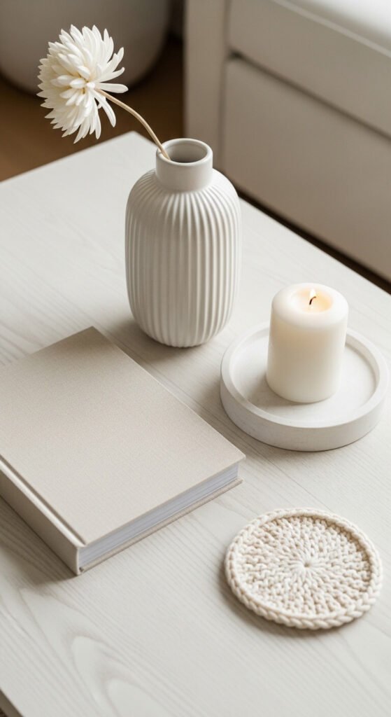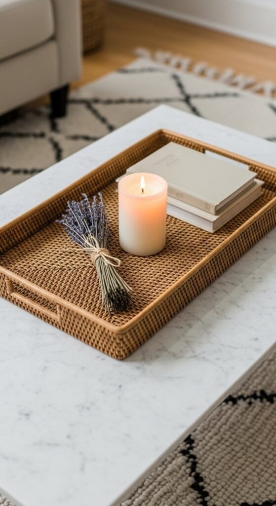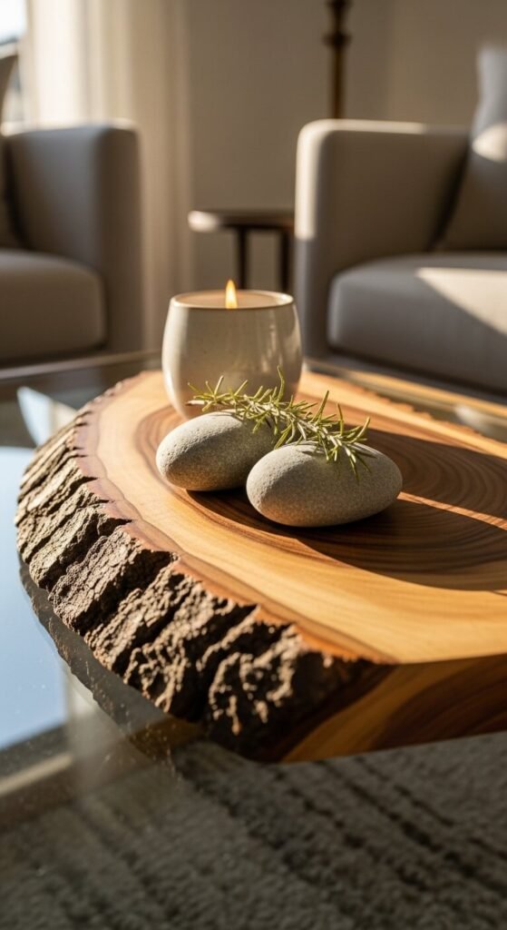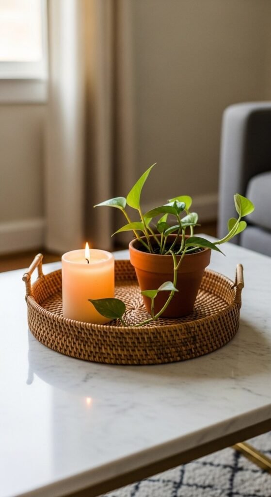 Natural materials ground a room and add organic warmth. A live-edge wood slice can serve as a decorative tray. A chunk of marble or a few smooth stones add cool contrast. A woven rattan coaster under a candle brings in texture. These materials layer well together — wood, stone, and fiber all complement each other naturally. Most can be found cheaply at craft stores, nature walks, or secondhand shops. You’re shopping the outdoors as much as the store.