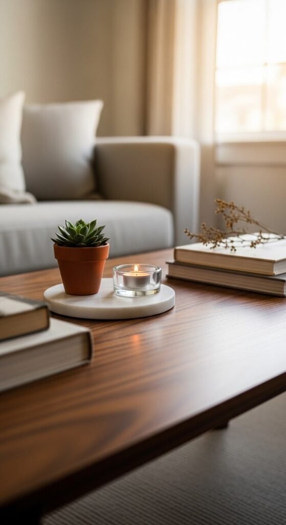 Your coffee table doesn’t need to look like a store display. A personal object — a small souvenir, a handmade pottery piece, a gift from a friend — adds a layer of authenticity that no staged arrangement can replicate. Guests notice these things and they start conversations. It tells your story without you having to say a word. Keep it simple: one meaningful piece among a few cleaner, more neutral items so it stands out without overwhelming the space.