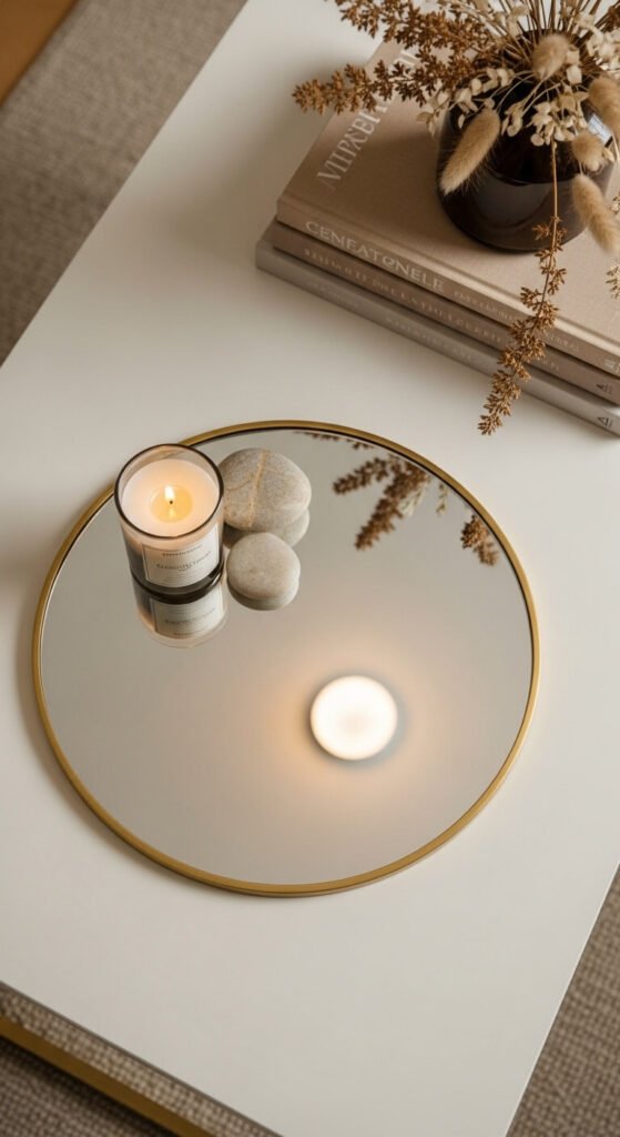 A mirrored surface reflects light and makes a space feel brighter and more open. You don’t need a large mirror — a small decorative mirror laid flat on the table works beautifully. Place a candle or small plant on top of it for an extra glow effect. Small mirrors can often be found at dollar stores or craft stores. Even a mirrored tray does the same job. It’s one of those little tricks that makes people say “oh, that’s clever” without knowing exactly why.
