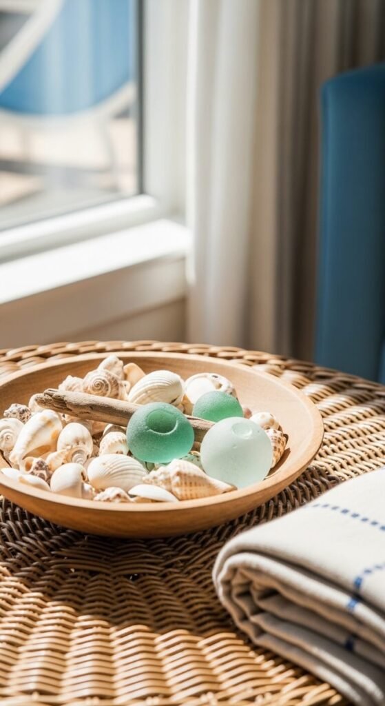 For a relaxed coastal feel, look no further than a beach walk or a craft store’s natural section. Arrange shells, sea glass, and small pieces of driftwood in a shallow bowl or wooden tray. It’s one of the most budget-friendly setups possible — many of these items are literally free if you live near water. Pair with a light, neutral tray and a single blue or green candle for a complete coastal look that feels collected, not costumey.