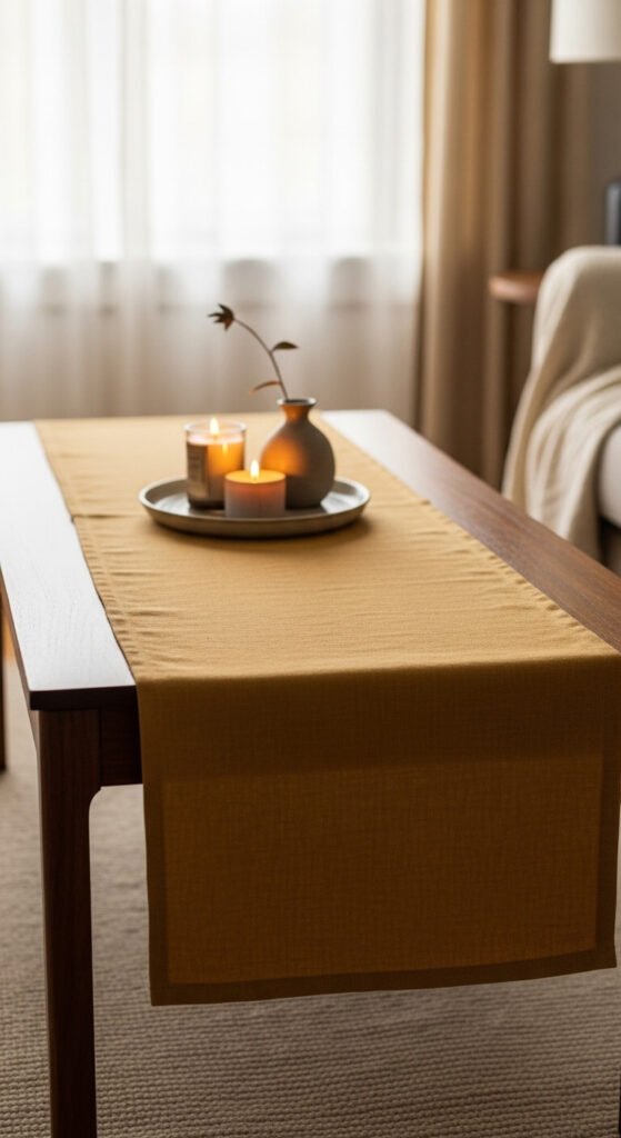 A table runner on a coffee table sounds unconventional — and that’s exactly why it works. A strip of linen, jute, or cotton defines the center of the table and gives your decor a grounded foundation without the rigidity of a tray. It adds texture and softness, especially on glass or cold stone surfaces. Cut a piece of inexpensive fabric to size or use a folded linen napkin. Layer your usual objects on top and the whole setup instantly feels warmer.