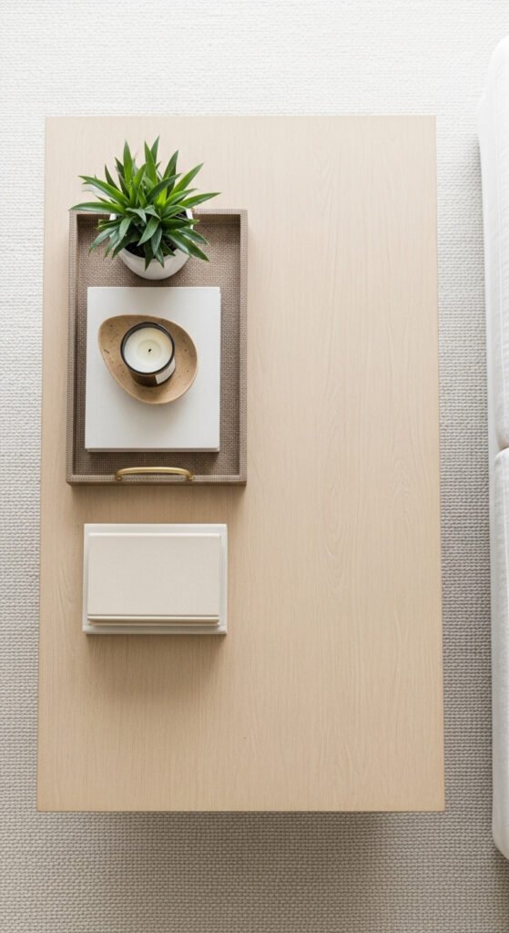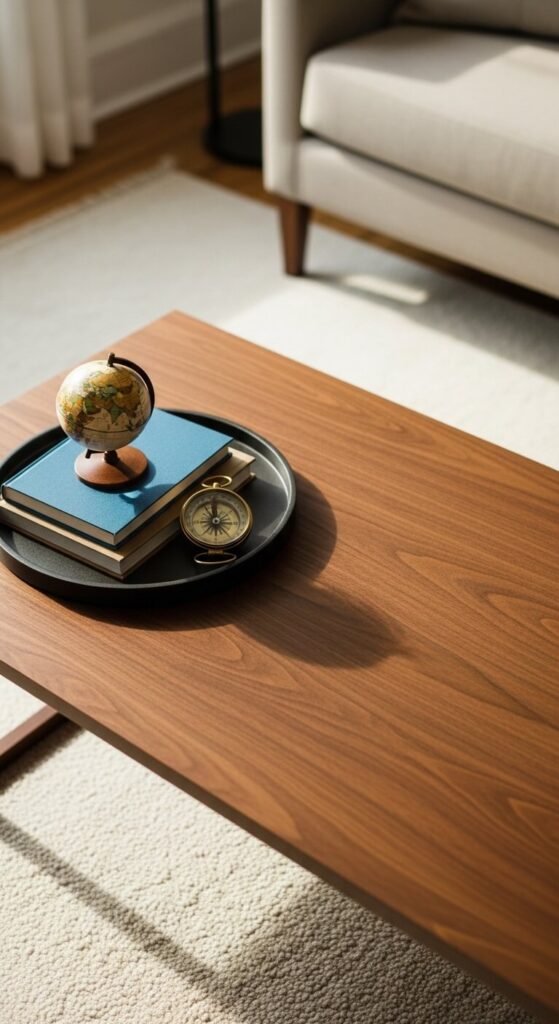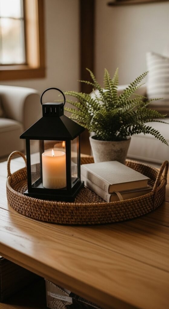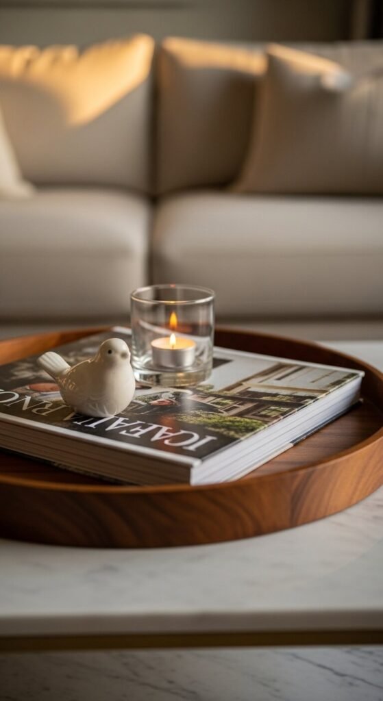 A tray pulls everything together. It gives your decor a defined boundary so the table doesn’t look cluttered. Use wood, rattan, or a simple lacquered tray from a dollar store or thrift shop. Place a candle, a small plant, and one decorative object inside. That’s it. Suddenly your table looks styled, not messy. Trays also make it easy to clear the table fast when guests come over — just pick up the whole tray and go.