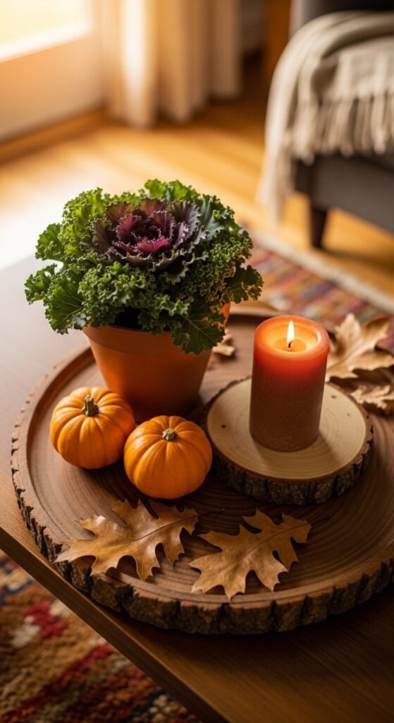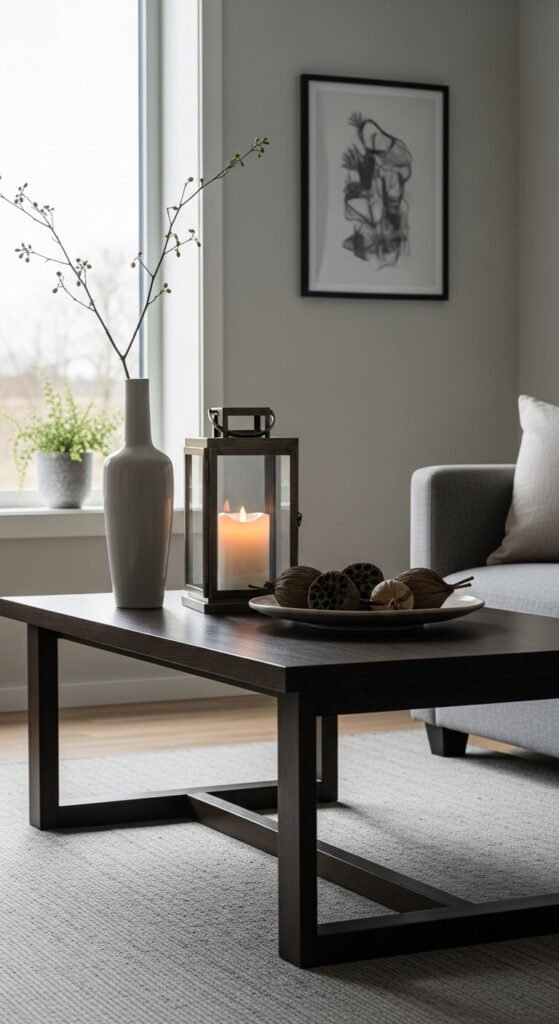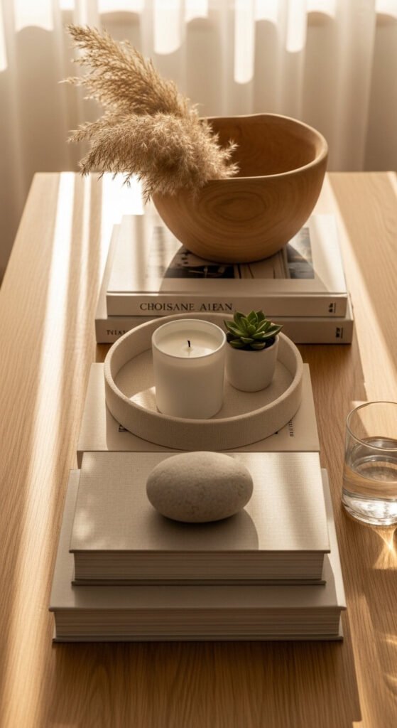 You don’t need to redecorate from scratch each season. A simple swap of a few key objects can completely change the feel of your table. Swap out a candle color, replace dried stems with seasonal branches, or bring in small seasonal fruits or gourds. In winter, add pine cones and deep jewel tones. In spring, use small bud vases with fresh flowers. Keep your base pieces — tray, books, neutral bowl — consistent and just rotate in seasonal accents.