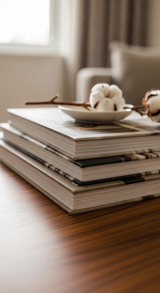 Books are one of the easiest styling tools you have. Stack two or three hardcovers with spines facing the same direction. Choose covers in neutral tones or colors that match your room. Top the stack with something small — a candle, a rock, or a small dish. Thrift stores are goldmines for beautiful books at under $2 each. You don’t need ones you’ve actually read. Just ones that look good and spark a question or two from your guests.