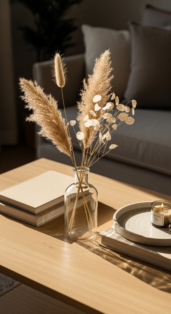 Dried botanicals are low maintenance and long-lasting. They look expensive and they never die. Pick up a few stems of pampas grass, bunny tail grass, or dried eucalyptus from a craft store or even online. Arrange them loosely in a simple vase — glass, ceramic, or even a bottle. No water needed. These arrangements can last months or even years with minimal care. They add warmth and texture without any ongoing effort on your part.