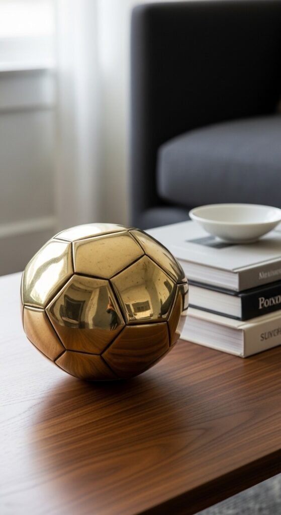 A geometric accent piece adds visual structure to a soft, layered arrangement. Think brass spheres, concrete cubes, or wire geometric frames. These pieces break up organic shapes like plants or bowls and add a modern edge. You can find them at TJ Maxx, HomeGoods, or Amazon for under $15. Gold and brass tones work in almost any color scheme. Even a single geometric object can make the whole table feel more intentional and styled.