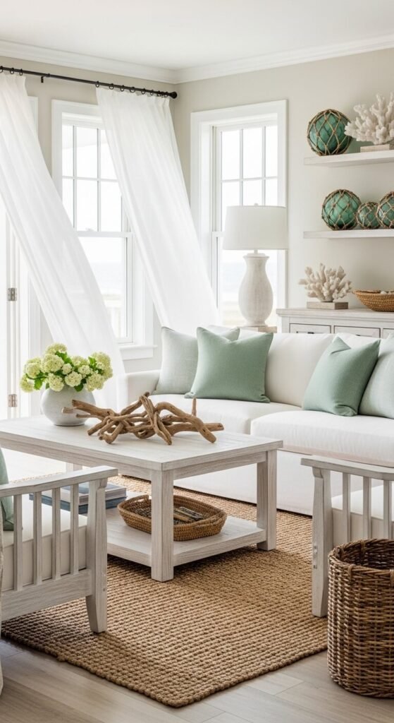 Coastal colors reflect nature—sky, water, sand, and weathered wood. Choose muted tones over bright primaries. Sherwin-Williams’ “Sea Salt” and Benjamin Moore’s “White Dove” are popular choices.