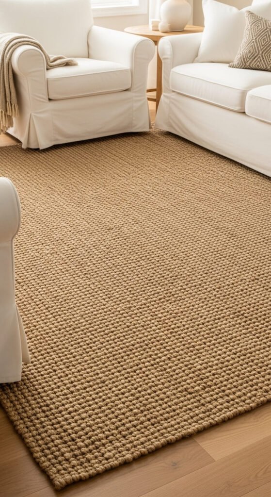Jute and sisal rugs cost $50-200 depending on size. The nubby texture and sandy color anchor rooms in beach-house style. They’re durable enough for high-traffic areas.
