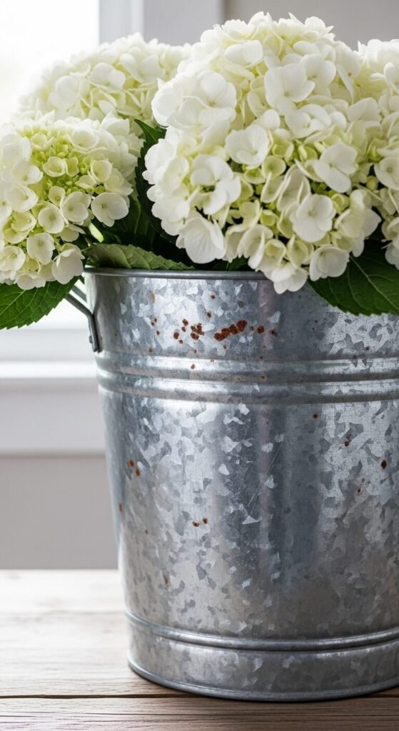 Use galvanized buckets, trays, and planters for industrial-coastal contrast.