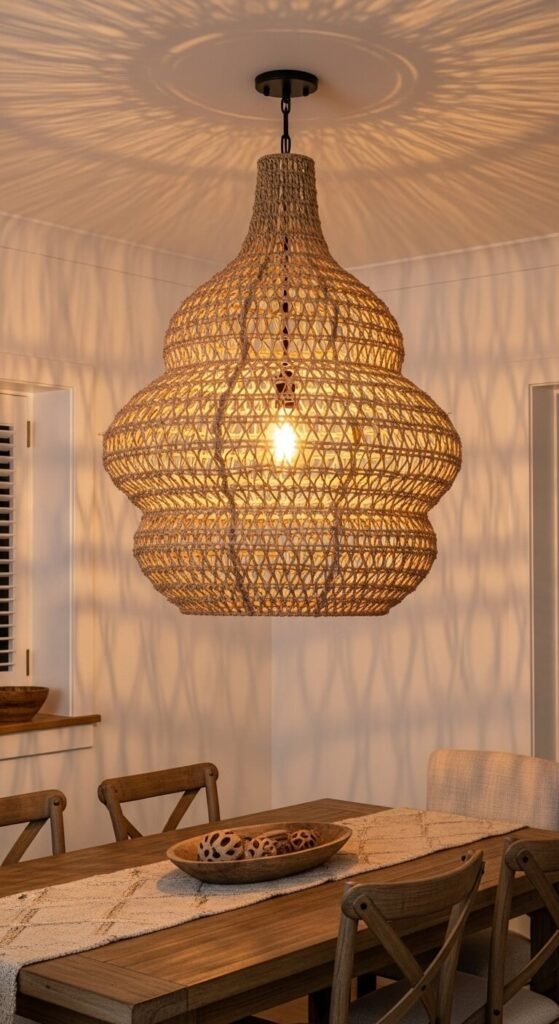 These fixtures cost $60-150 and transform a room instantly. The natural material filters light beautifully and adds texture overhead. Hang them over kitchen islands, dining tables, or in entryways.