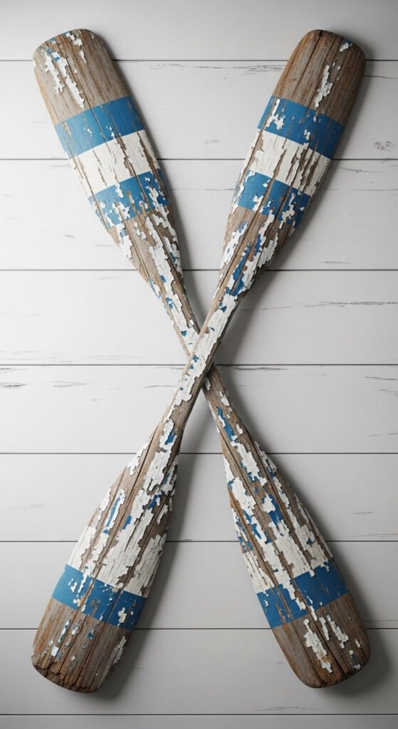 Hang vintage oars or paddles on walls as sculptural decor.