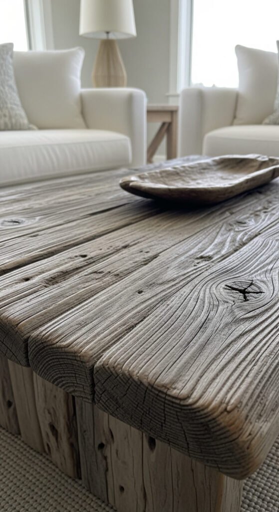 Thrift stores and estate sales offer solid wood pieces you can refinish. The imperfect, lived-in look feels more coastal than pristine furniture. Mix different wood tones for an eclectic, collected-over-time vibe.