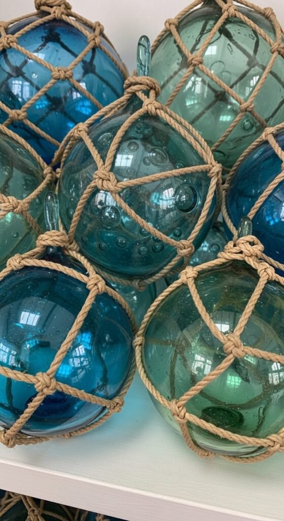 Display glass fishing floats in rope netting or bowls.