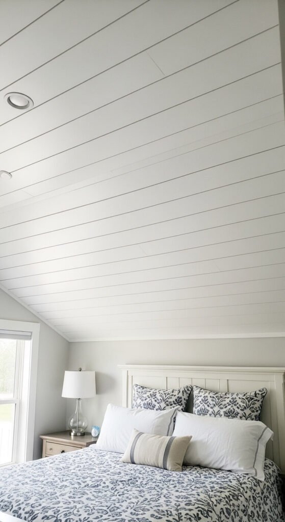 This DIY costs $1-2 per square foot for materials. White shiplap or beadboard draws the eye up and adds dimension. It works in bedrooms, bathrooms, porches, and kitchens.