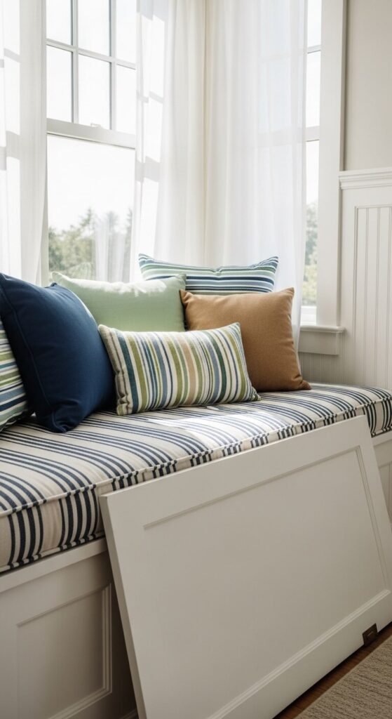 Window seats create cozy spots that feel beachy and inviting. They work in kitchens, bedrooms, or hallways. Add pillows and throws for comfort. The extra seating and storage solve practical problems while adding character.