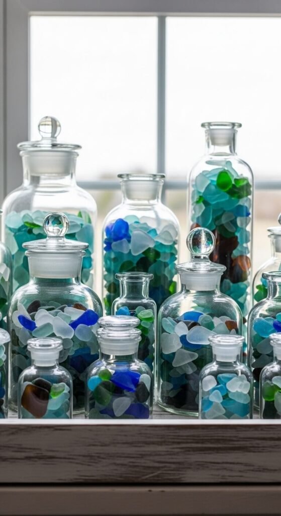 Buy sea glass online in bulk for $10-20 per pound or collect your own at beaches. Layer different shades in mason jars, glass vases, or apothecary bottles. The translucent pieces catch light beautifully.