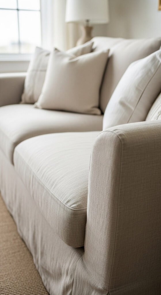 Ready-made slipcovers cost $80-200 depending on furniture size. Linen wrinkles naturally, which adds to the relaxed coastal vibe. The breathable fabric stays cool and feels casual.