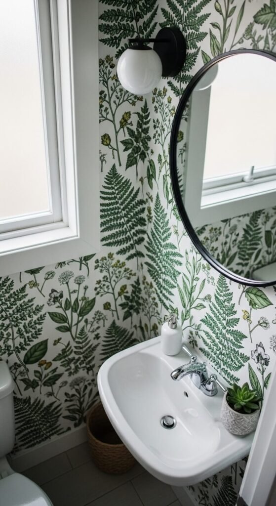 Bathrooms are the best rooms to experiment with wallpaper. The smaller the room, the bolder you can go. A detailed botanical print turns a plain bathroom into something special. Look for moisture-resistant or vinyl wallpapers designed for bathrooms — they hold up far better than standard paper in humid conditions. This is also a great spot for peel-and-stick because the surface area is small and manageable. A roll or two is usually enough to cover a small bathroom entirely.