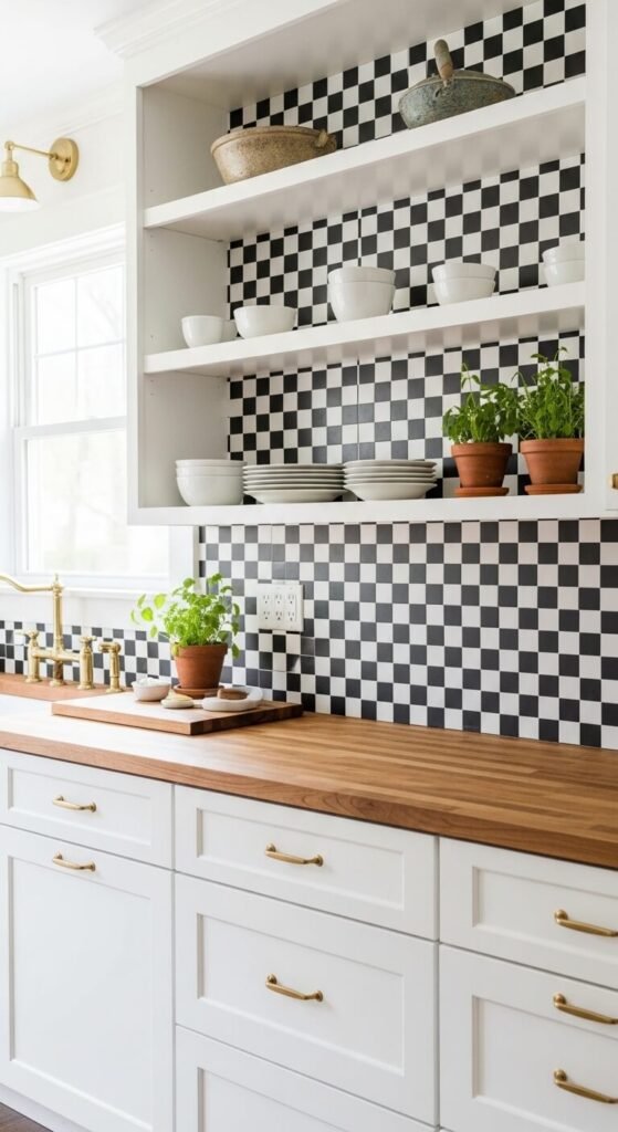 Checkerboard prints feel retro and fun, especially in a kitchen. You don’t need to wallpaper the whole kitchen — use it as a backsplash feature behind open shelves or around a window. This avoids moisture-heavy areas near the sink. Peel-and-stick wallpaper works well here for renters. Black and white is the classic choice, but cream and terracotta, or sage and white, feel warm and current. It’s a budget-friendly way to give a plain kitchen real personality.