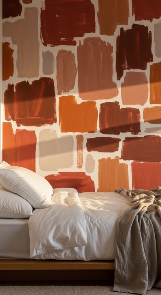 Terracotta tones are warm, grounding, and endlessly livable. An abstract pattern in earthy shades — rust, burnt orange, sandy cream — feels modern without being cold. This works beautifully in bedrooms and living rooms. It pairs naturally with wood, rattan, linen, and plants. Look for abstract watercolor or brushstroke-style prints for a handmade quality. Peel-and-stick options are widely available in this colorway, making it accessible without the commitment of traditional wallpaper paste.