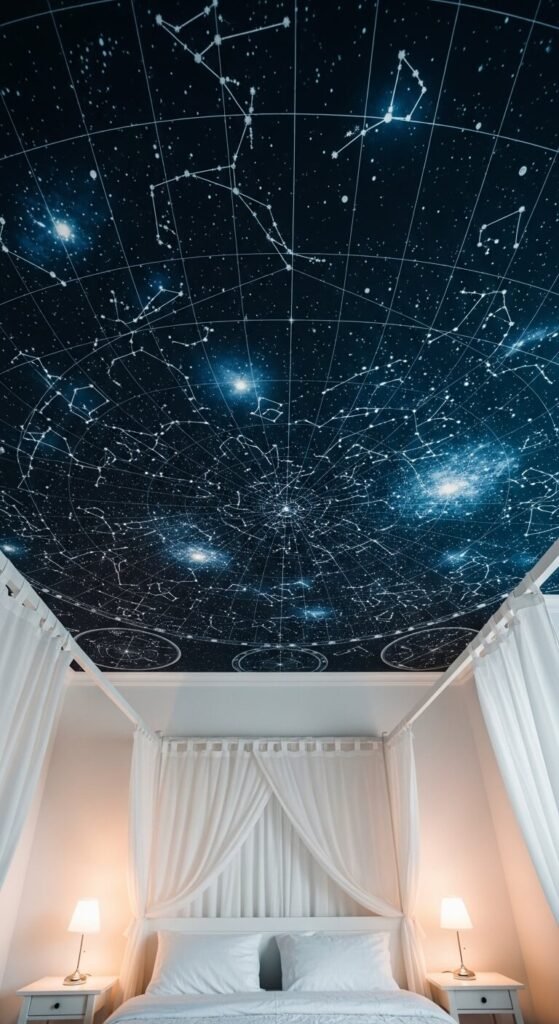 Most people forget the ceiling entirely. Wallpapering the ceiling creates a moment that’s completely unexpected. A star map, a soft cloud print, or a subtle texture on the ceiling makes the room feel larger and more intentional. Keep the walls simple — plain white or a soft neutral — so the ceiling gets all the attention. This is a surprisingly manageable DIY project with a helper. Peel-and-stick makes the ceiling even easier to tackle without permanent commitment.