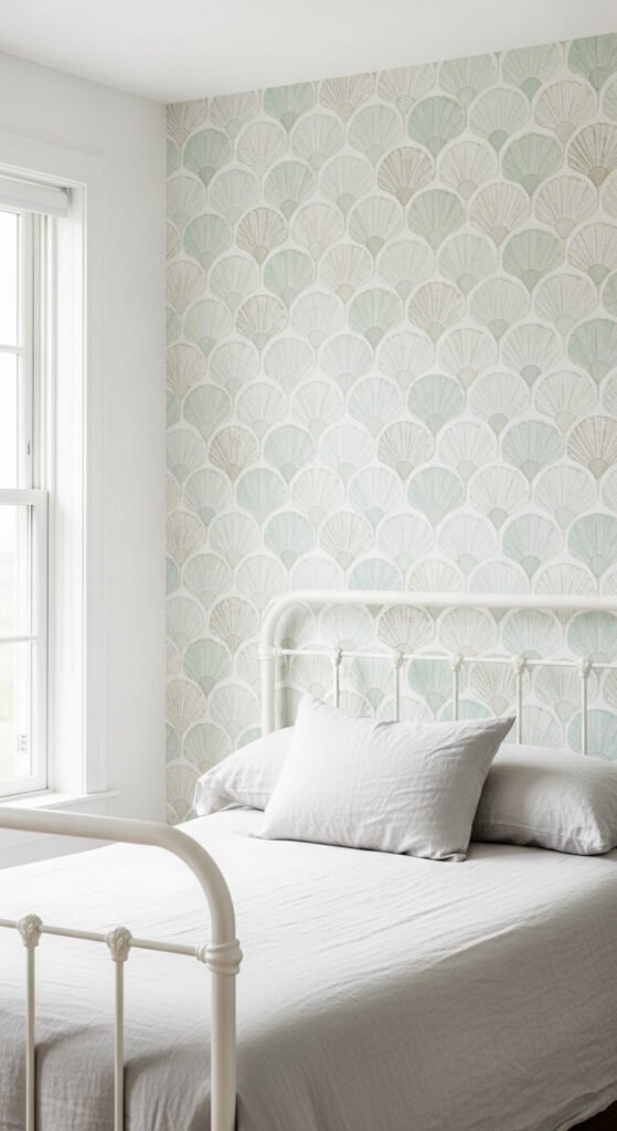 Scallop and shell prints capture a coastal feeling without tipping into tacky territory. Soft colorways like seafoam, sandy beige, and white keep it sophisticated. This works well in bedrooms, bathrooms, and reading corners where a relaxed, breezy vibe makes sense. One accent wall is usually enough. Pair with natural textures — jute rugs, linen, wicker — rather than synthetic materials. Budget tip: look for scallop-pattern wallpaper on Etsy or Spoonflower, where independent designers often offer more affordable per-roll pricing.