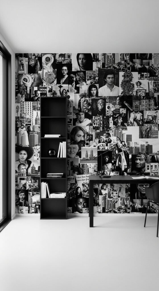 Photography-style wallpaper brings a graphic, editorial energy to any room. Large-scale black and white prints feel bold and artistic without requiring actual art on the walls. This works best in home offices, studios, or a media room where a punchy visual backdrop makes sense. Keep the rest of the room very simple — let the wall be the statement. Many printing companies allow you to upload your own photos and print them as custom wallpaper, making it deeply personal without being expensive.