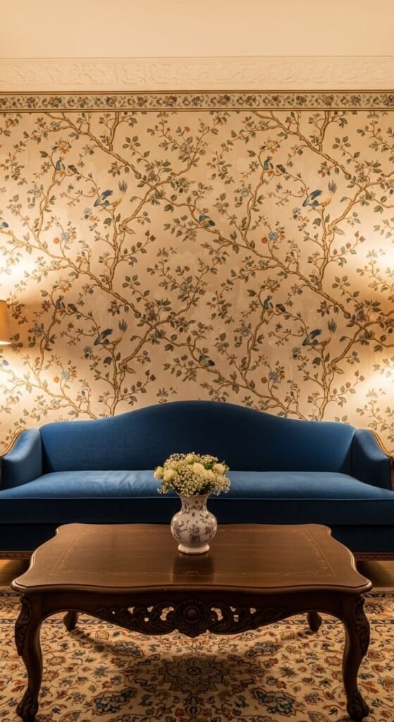 Chinoiserie wallpaper is one of the most storied decorating traditions — and it still looks extraordinary. Hand-painted-style prints with birds, branches, and blossoms are the signature of this style. It works in living rooms, dining rooms, and bedrooms. Traditional Chinoiserie can be expensive, but modern printed versions capture the same look at a fraction of the cost. Stick to a light background with colorful motifs for a fresh, airy feel, or choose a dark background for something more dramatic.