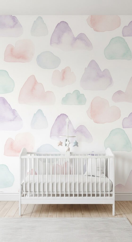 A nursery doesn’t have to mean cartoon characters. Soft watercolor abstracts in blush, lilac, sage, or mint create a dreamy, gender-neutral space. The washed-out quality of watercolor prints is gentle on the eye and grows with the child — it won’t look babyish when they’re a toddler. Peel-and-stick is ideal here since nursery décor changes often. Install it yourself on one accent wall behind the crib for a thoughtful focal point that photographs beautifully too.