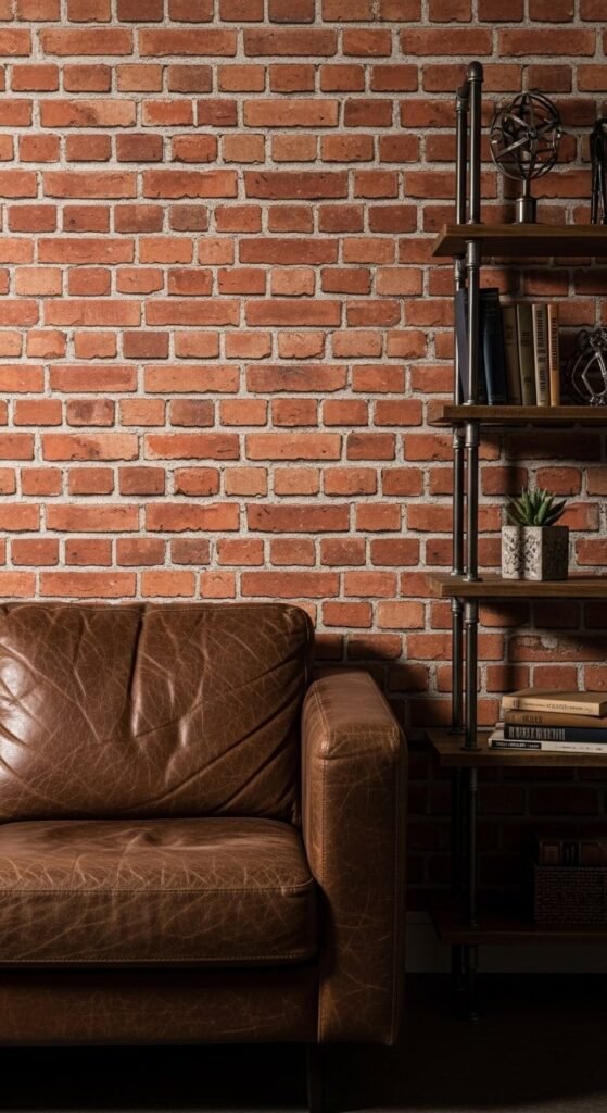 Can’t knock down a wall to expose brick? Brick-effect wallpaper is the next best thing. Modern versions are incredibly realistic — they mimic the texture, color variation, and depth of actual brick. This works in living rooms, home bars, studios, and entryways where an industrial or urban edge fits the style. It’s especially popular in rental apartments where real brick isn’t an option. Look for 3D embossed versions for the most convincing effect. Pair with leather, dark wood, and Edison bulbs.