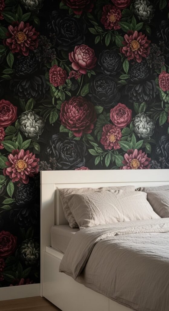 A dark floral accent wall instantly makes a bedroom feel rich and intentional. You don’t need to paper all four walls. One bold wall behind the bed is enough. Look for peel-and-stick options if you rent — brands like Chasing Paper and Tempaper offer stunning dark floral designs. Keep the rest of the room neutral so the wall does the talking. This works especially well in small bedrooms where a full room of dark print might feel overwhelming.