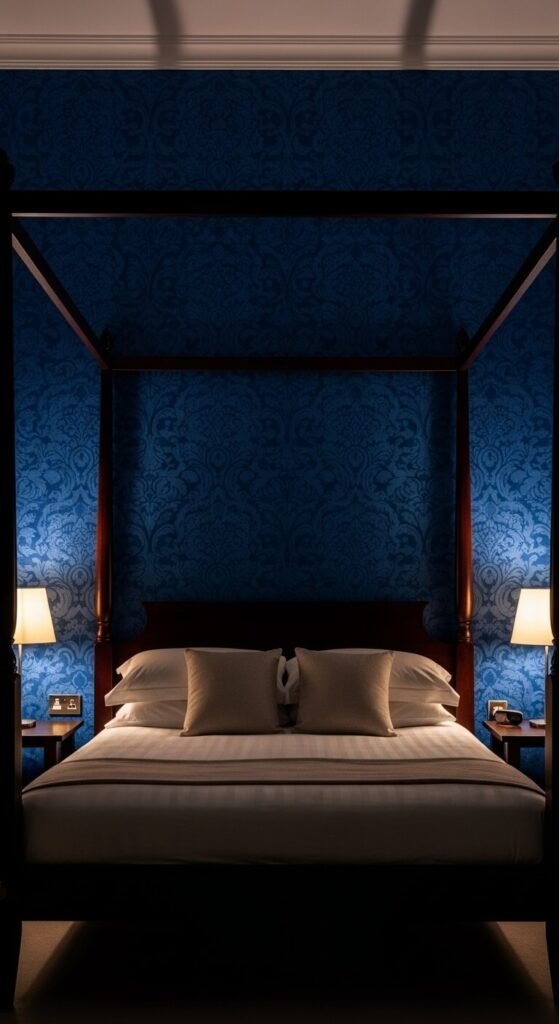 Damask patterns in deep blue create a bedroom that feels like a luxury hotel. The symmetrical, ornate pattern adds formality without feeling stiff. Navy, sapphire, and midnight blue are all strong choices. Pair with warm wood furniture and cream or white linens to balance the depth. Traditional damask can look dated, so look for more modern takes — oversized scale, simplified motifs, or matte finishes that feel current. One accent wall behind the bed is plenty. It’s a high-impact choice with very manageable installation.
