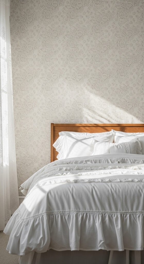 Lace-print wallpaper adds romance and texture without color commitment. The pattern reads as both traditional and modern depending on the furniture you pair it with. In an all-white bedroom, lace wallpaper adds warmth and softness that flat white paint never achieves. In a room with bold furniture, it acts as a calm backdrop that stops the space from feeling too stark. Look for embossed versions that add actual raised texture, or flat-printed options that are more budget-friendly and easier to install.