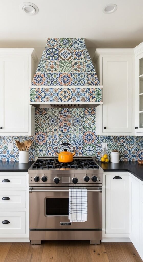 22. Colorful Maximalist Tile-Print Wallpaper in a Kitchen