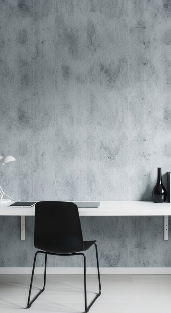 Concrete-effect wallpaper is perfect for a home office or studio where you want an industrial, no-fuss aesthetic. It mimics raw poured concrete in grey tones with subtle texture variation. Unlike real concrete, it’s warm and lightweight, won’t crack, and can be removed. This is especially popular in Scandinavian-inspired interiors. Pair with white or black furniture, minimal accessories, and task lighting. The effect is surprisingly convincing in photographs and videos — which makes it a popular choice for content creators working from home.