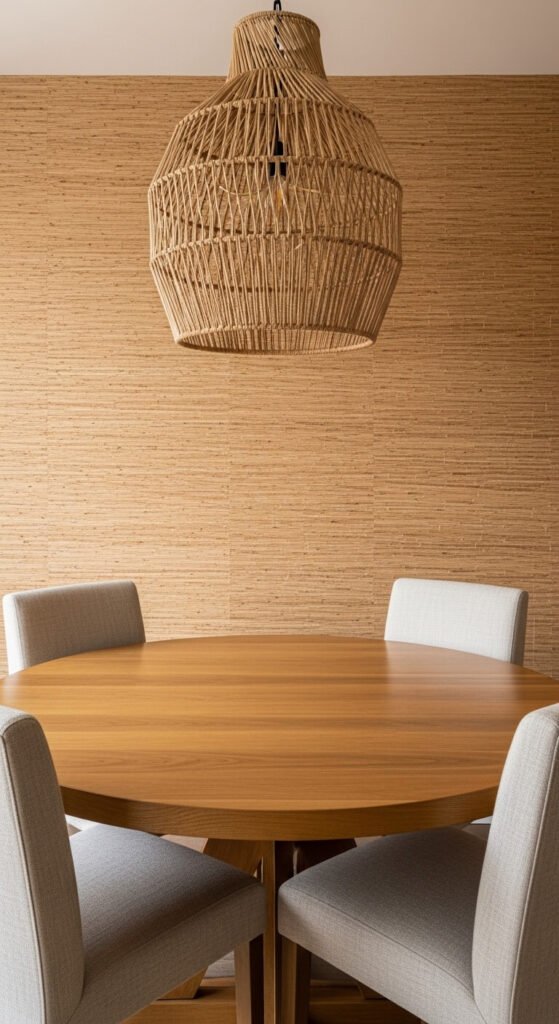 Grasscloth wallpaper adds texture that makes a dining room feel warm and grounded. It’s made from natural fibers woven onto a paper backing, giving walls a layered, organic look. It photographs beautifully and hides minor wall imperfections. You can find grasscloth-look vinyl alternatives for a fraction of the price. These work great for renters too. Pair it with warm wood furniture and soft lighting for a space that feels pulled together without trying too hard.