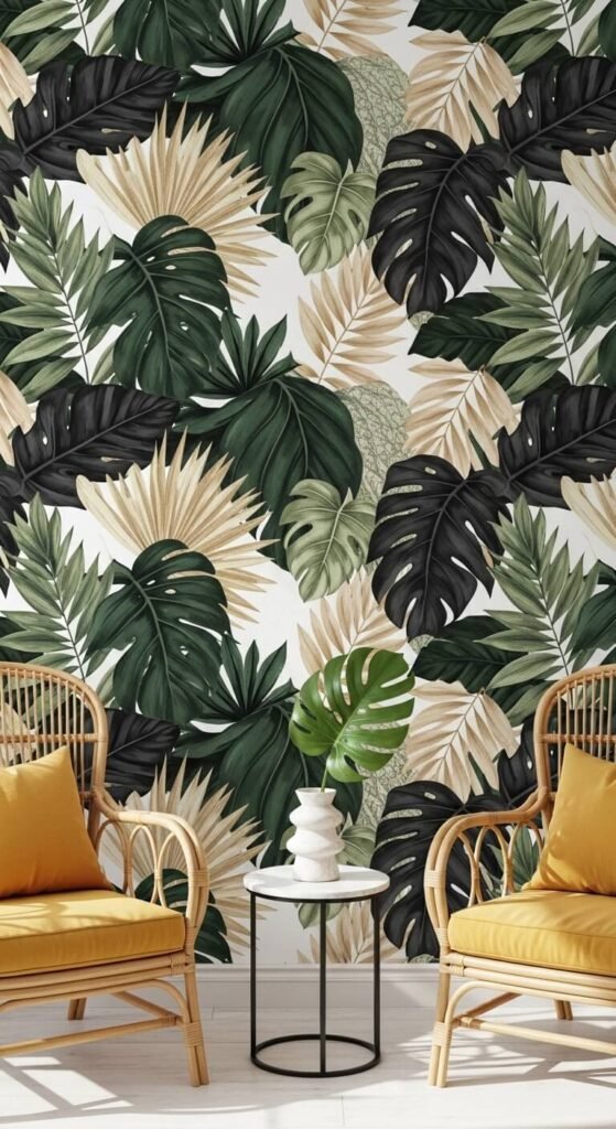 Jungle wallpaper is a commitment — and that’s exactly the point. Big, leafy prints with birds, palms, or banana leaves create an immersive, almost cinematic room. This works in any room where you want drama. A powder room, a reading nook, or a dining room are perfect spots. If the budget is tight, paper just one wall and paint the rest a color pulled from the print — like hunter green or terracotta. It ties the room together without the full cost.