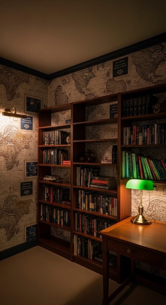 5. Vintage Map Wallpaper in a Home Library