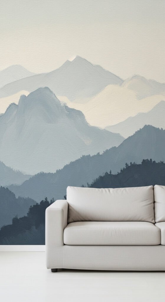 Mural wallpaper turns one wall into a piece of art. It’s printed as a single panoramic image — no repeating pattern, no matching seams. This is the most dramatic option on this list. Mountain ranges, abstract brushstrokes, and forest scenes are popular choices. Most mural wallpapers come pre-cut into panels you paste up in order. Budget tip: measure your wall exactly and order only what you need. Many companies let you size the mural to your exact wall dimensions.