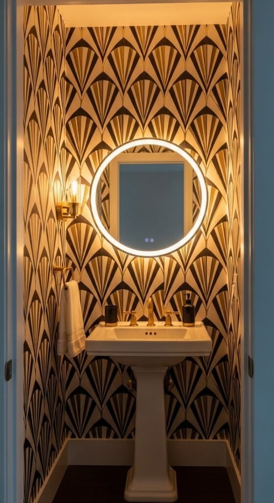 Art Deco geometric wallpaper feels glamorous without being over the top. Fan shapes, diamond lattices, and sunburst patterns are classic choices. This style works best in smaller spaces — a powder room, entryway, or closet — where the intensity can shine without overwhelming a large room. Black and gold is the classic combo, but navy and brass or blush and rose gold feel more current. Pair with simple, clean-lined furniture so the wall stays the focal point.