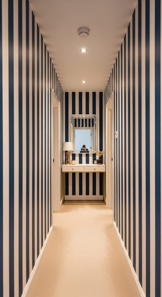 Vertical stripes make any room feel taller. This is one of the most practical wallpaper ideas on this list. In low-ceilinged rooms or narrow hallways, a strong vertical stripe draws the eye upward and creates a sense of height. Wide stripes feel bold and modern; thin pinstripes feel classic and tailored. Stick to two colors for a clean look. If you’re nervous about pattern, a tone-on-tone stripe — like cream on white — adds visual interest without high contrast.