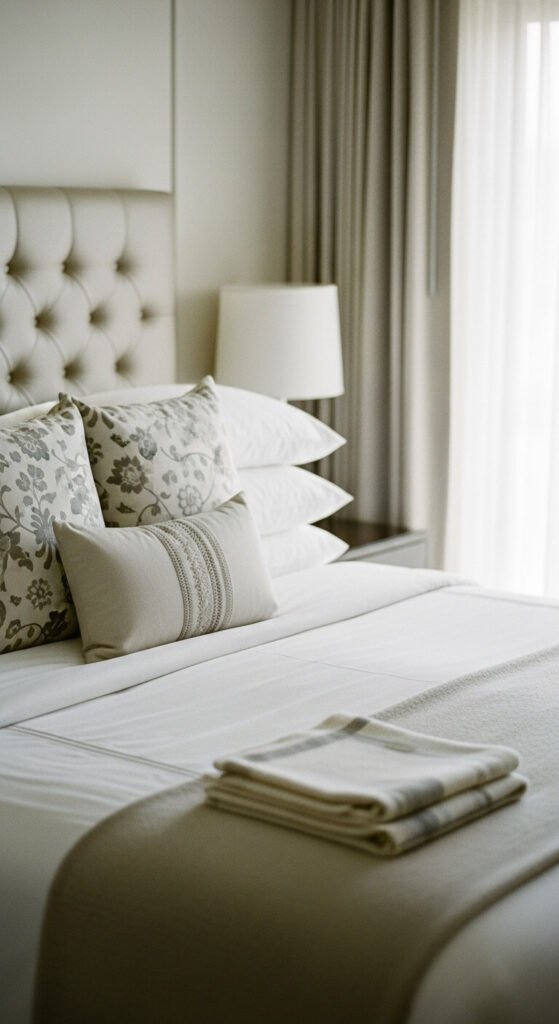 More than three colors on a bed creates visual noise. Hotels keep palettes tight for good reason — it’s calming and cohesive.