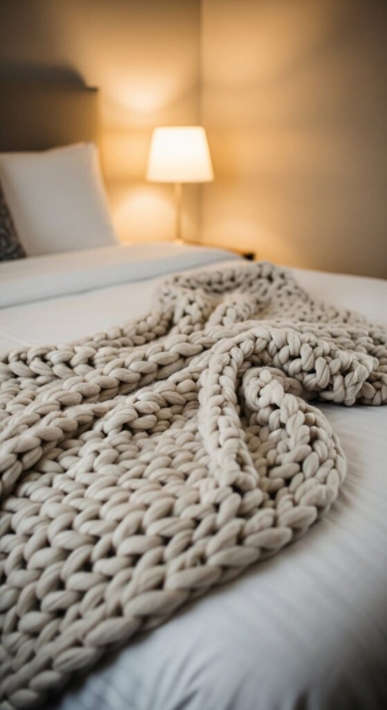 A throw blanket draped at the foot of the bed is a classic hotel styling move. It adds warmth, texture, and a sense of luxury in one step.