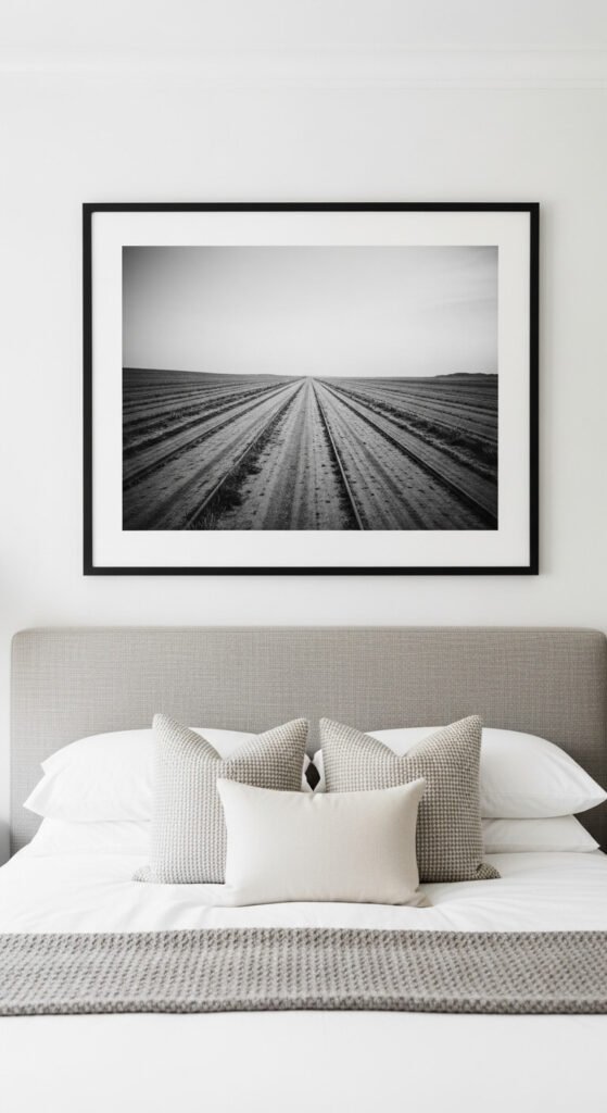 One large piece always looks better than a cluster of small ones above a bed. Aim for a canvas or frame that’s roughly two-thirds the width of your headboard.