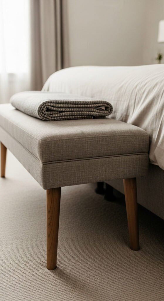A bench or upholstered ottoman at the foot of the bed is a signature hotel styling detail that most home bedrooms skip.